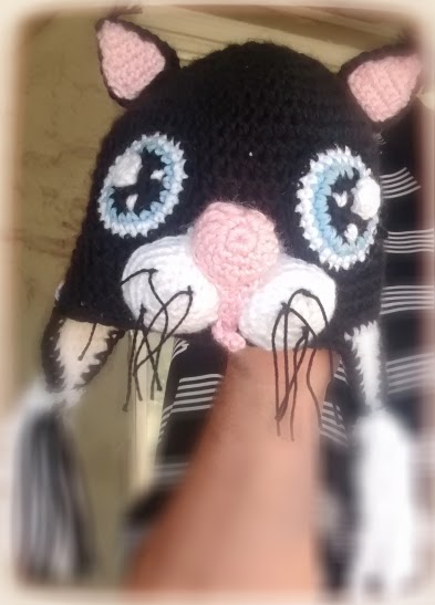 This is not the cat with the hat this is the cat hat. Black and white Red heart yarn and a 6 mm crochet hook. The eyes are crocheted so they look like animated eyes. I just love animated eyes.